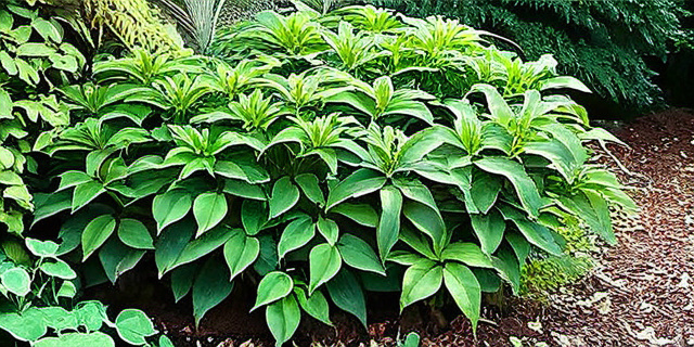- Хоста — растение с красивыми декоративными листьями различных оттенков. Предпочитает влажную почву и умеренную тень. Хорошо смотрится в больших садах и на тенистых клумбах.